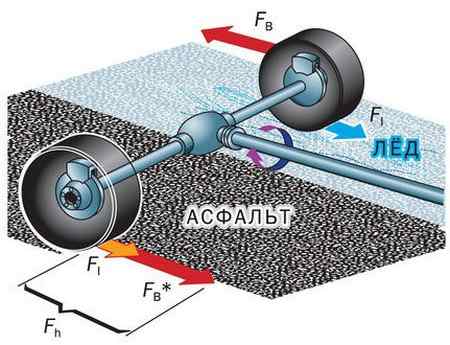 - Попадание одного колеса на заснеженную дорогу. Часто бывает, что дорожное полотно почищено не идеально. В такой ситуации водитель рискует угодить одним из ведущих колес на снежную часть дороги, а другое будет двигаться по чистому асфальту. Поскольку у одного из колес возникнет вероятность проскальзывания, это может привести к тому, что при резком движении руля автомобиль уйдет в занос, и водитель потеряет управление. Чтобы этого не произошло, антипробуксовочная система, работая в связке с системой стабилизации курсовой устойчивости, перераспределяет момент, притормаживая проскальзывающее колесо;