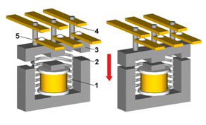 При подаче питания на катушку, рама (3) с контактами (4) опускается и замыкает свои контакты на соответствующие неподвижные контакты (5).