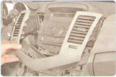 8. Поддев отверткой края центральной накладки панели приборов.