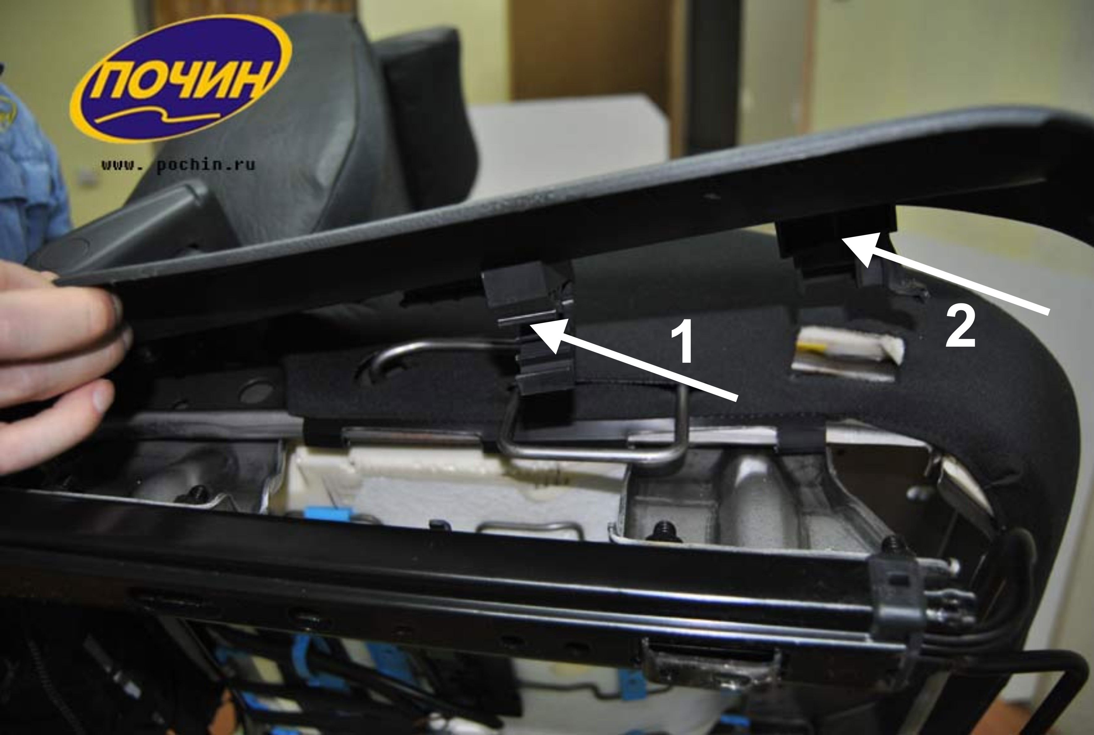 11. Устанавливаем боковую пластмассу на переднем сиденье. Сначала закрепляем пластиковый крепеж 1, затем 2.