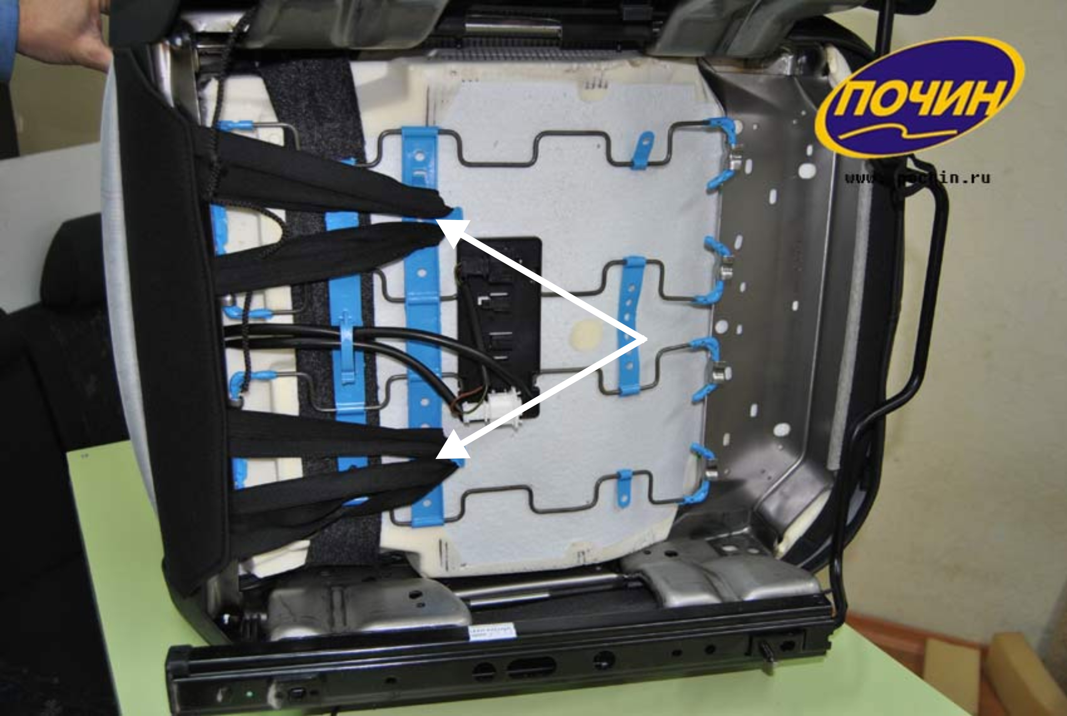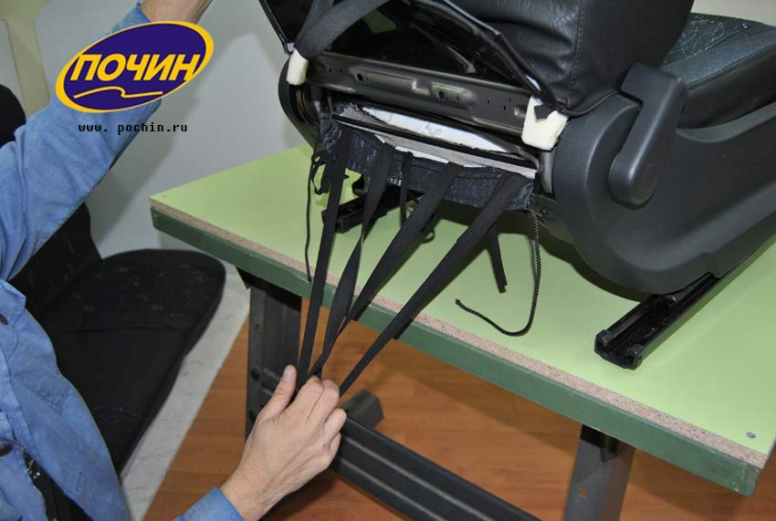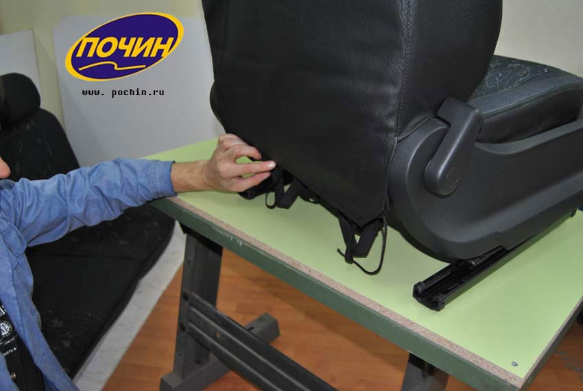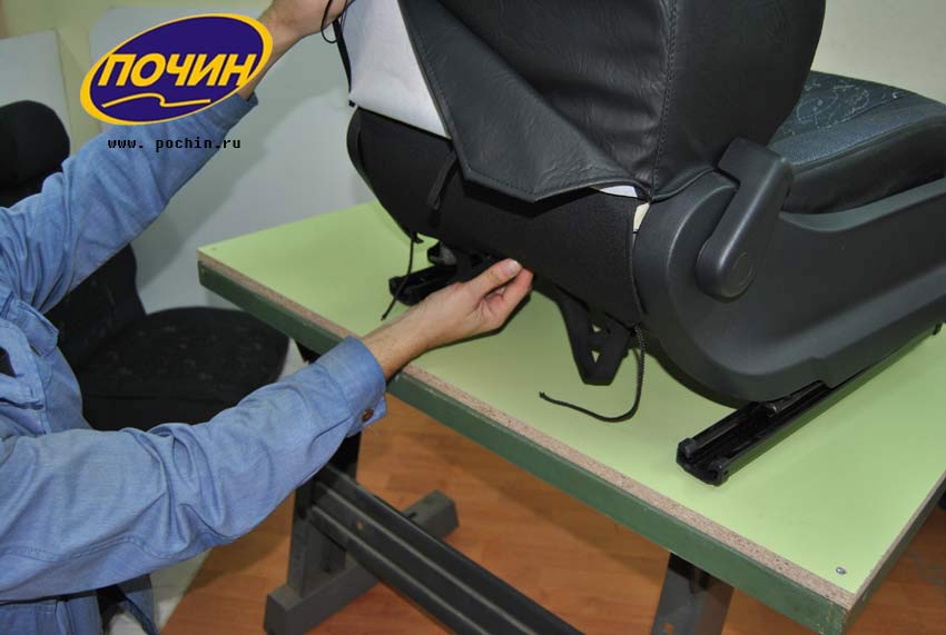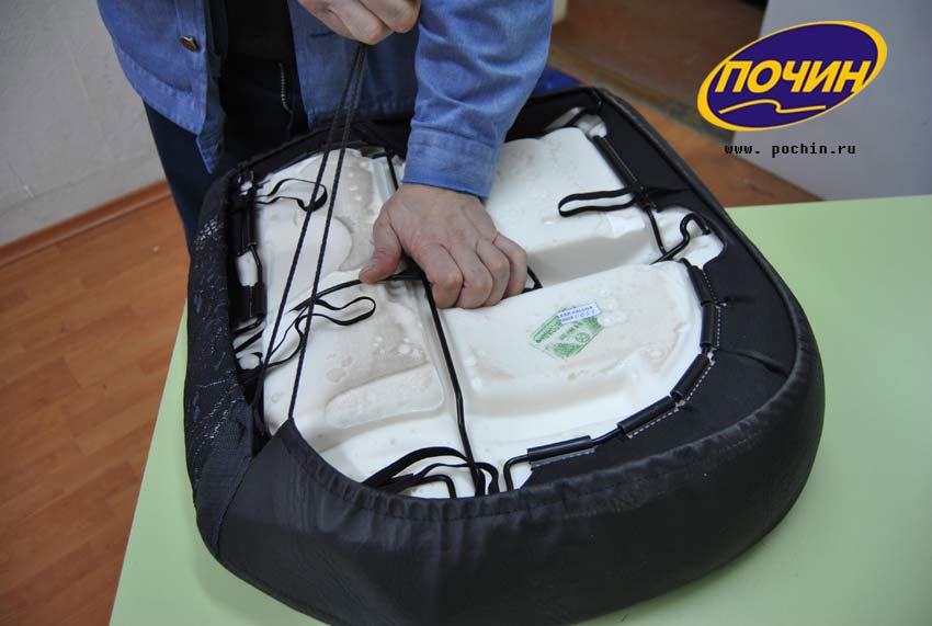 10. Устанавливаем поочередно штатную обивку сиденья и чехлы на спинку и сиденье. Все резинки крепятся под передним сиденьем.