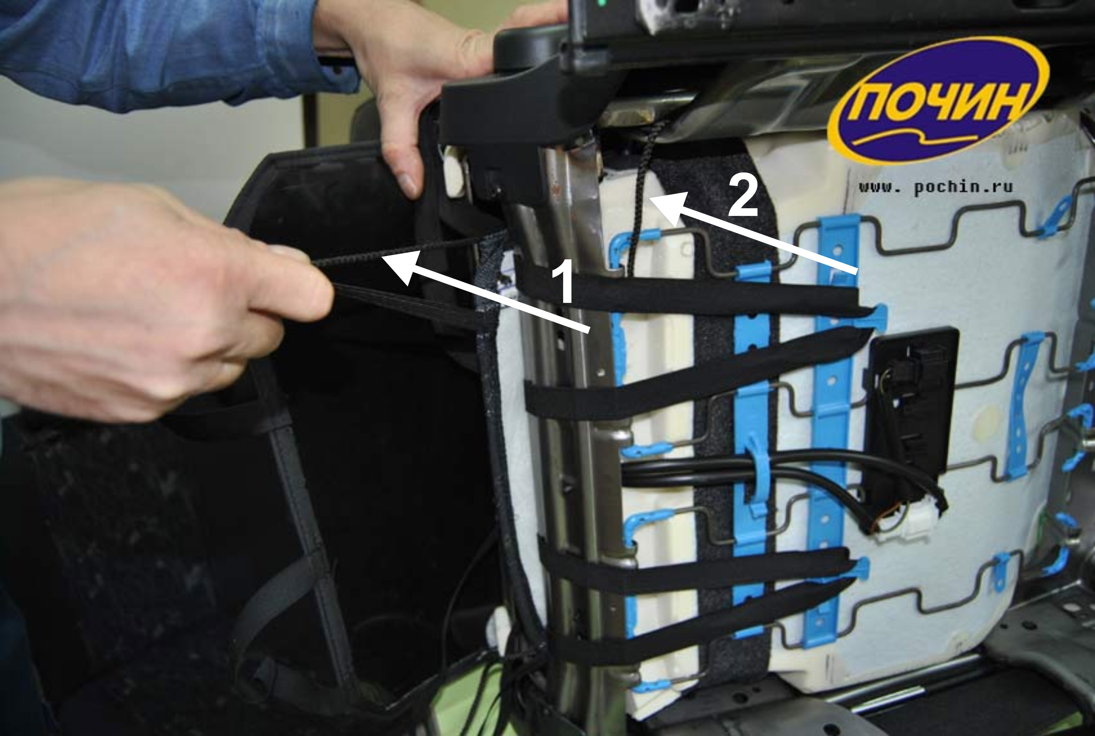Для того чтобы снять обшивку кресла Volkswagen Polo, необходимо снять ленточные держатели обшивки спинки с креплений на нижней стороне каркаса сиденья, освободить жгуты проводов подогрева и частично вывернув нижний край обшивки, снять ее со спинки кресла вверх.