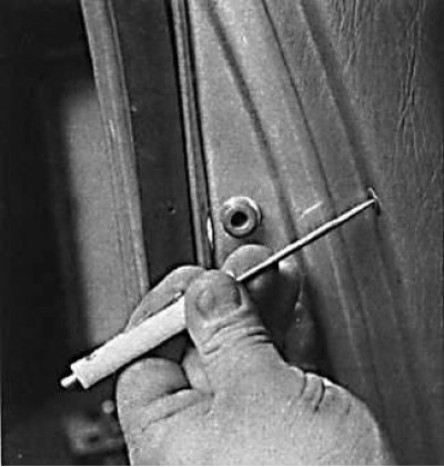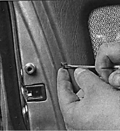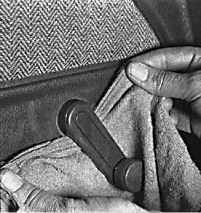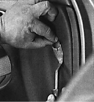 3. На моделях с ручным стеклоподъемником полностью закройте окно и отметьте расположение ручки стеклоподъемника. Освободите скобу крепления и снимите ручку. Скоба освобождается, если вставить чистую ткань между ручкой и обивкой двери и, протягивая ткань напротив концов скобы, зацепите скобу и освободите ее. При этом необходимо натягивать ручку на себя, чтобы она после освобождения скобы снялась со шлицов стеклоподъемника.