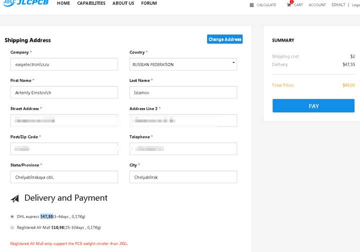 1. Цены — аналогичные заказы в России будут стоить в разы дороже. Была такая история — одна известная контора в г. Зеленоград за плату запросил 14 000 рублей за 1 плату, JLCPCB изготовила этот же заказ за примерно 5000, включая доставку и в количестве 5 плат. Платы размером менее 100*100 и со стандартными параметрами там действительно очень дешевы, стоимость может быть от 130 до 350 рублей. Цена будет зависит от параметров: формы, количества металлизированых отверстий, минимальных диаметров, расстояния между отверстиями, цвета маски, наличия иммерсионного золочения и т.п. В обще у них на сайте все расписано, хоть и не очень подробно.