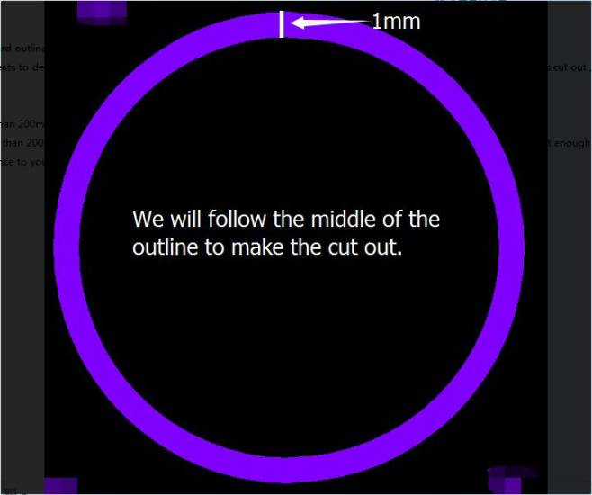 Usually, we suggest our clients design 0.15mm for the thickness of board outline,slots,cut out ,millings.But if the thickness of the board outline,slots,cut out ,millings are bigger than 0.15mm,we will follow the center of the line to make the board outline,cut out ,millings.