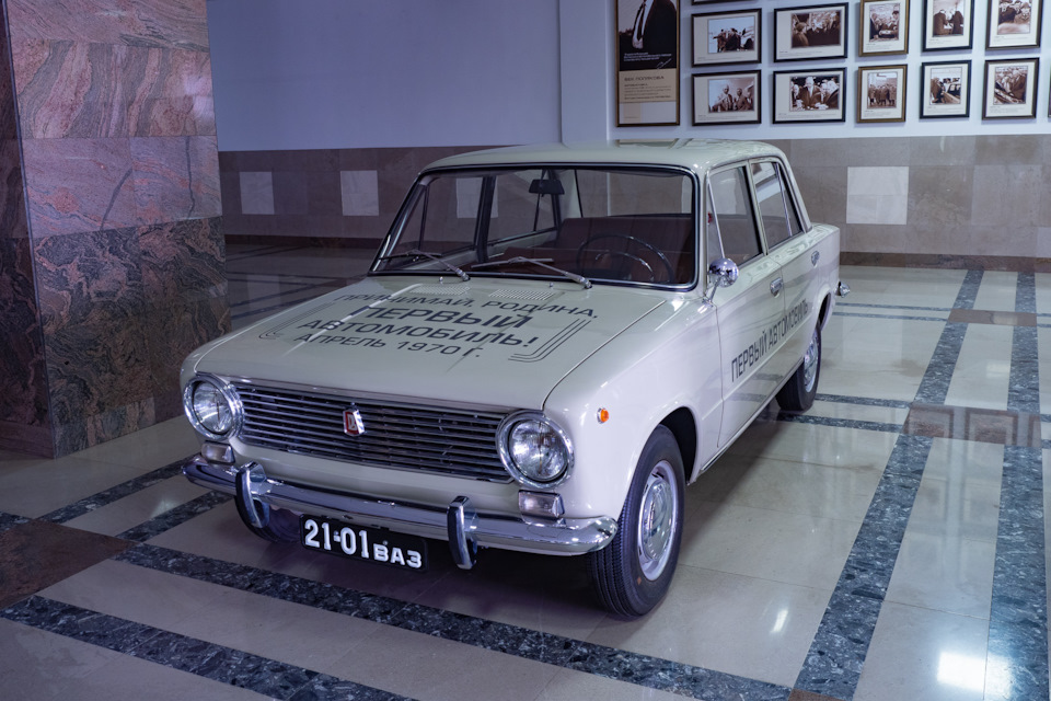 Такой автомобиль встретил меня в фойе высотки заводоуправления. Это первая выпущенная “копейка”. К слову, это здание в народе называют “свечка” или “изолента”. Мимо “шоколадки” инжиниринга (НТЦ), направляемся в комплекс заводских цехов.